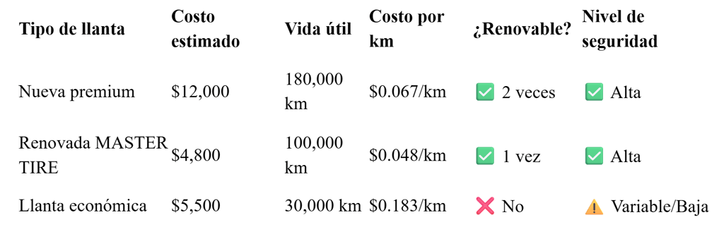 Elegir una llanta no debería ser solo una decisión de precio. Es una decisión de rentabilidad, seguridad y estrategia logística. En MASTER TIRE, te lo explicamos con datos reales: