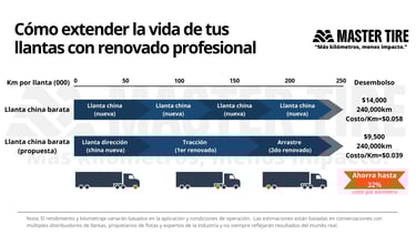 Estima el costo por kilómetro de tu operación y compara escenarios de llanta nueva vs. renovado profesional.